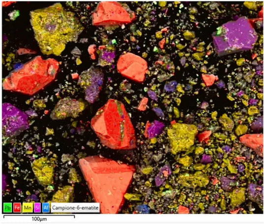تصویر محتویات رژ لب که با رنگ‌های کاذب بهبود یافته است: قرمز (هماتیت)، زرد (برونیت)، صورتی (کوارتز) و سبز (گالن)