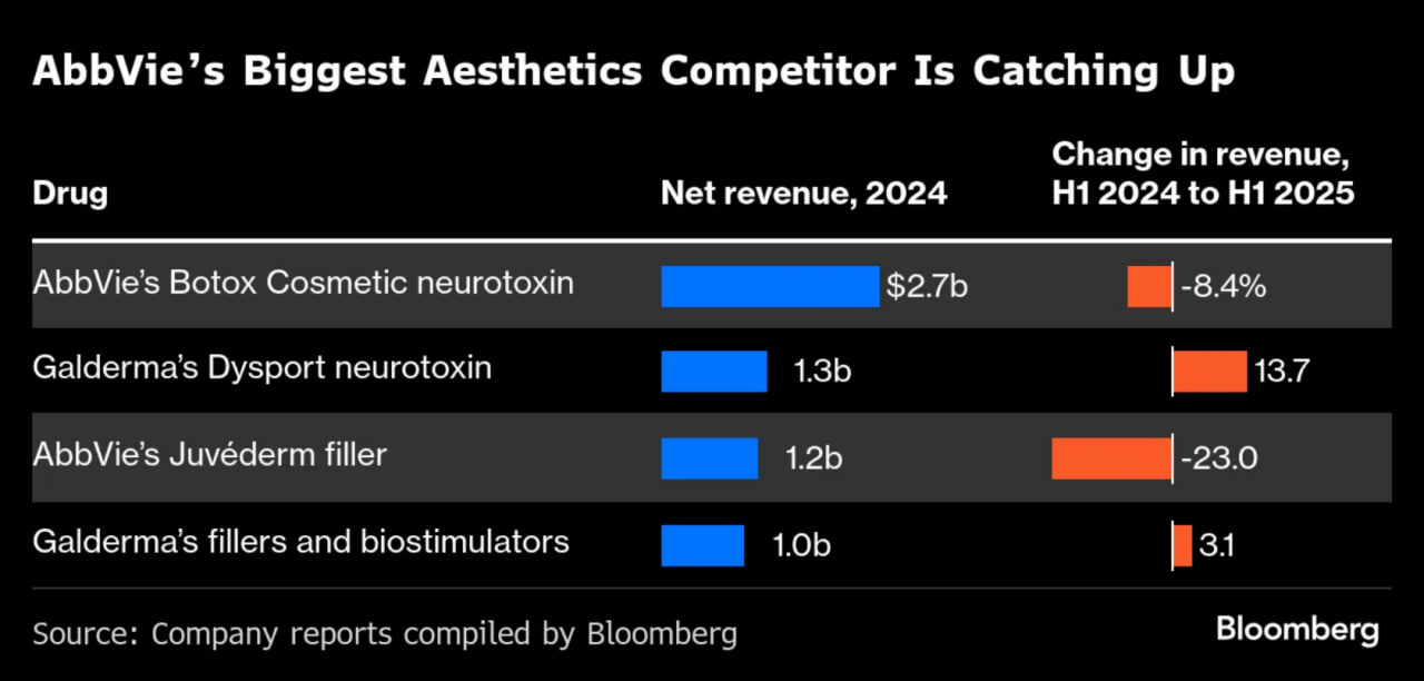در نیمه نخست ۲۰۲۵ نیز فروش بوتاکس و فیلر ژوویدرم به ترتیب ۸/۴ و ۲۳ درصد کاهش یافتند درحالی‌که فروش محصولات رقیب شرکت گَلدِرما به ترتیب ۱۳/۷ و ۳/۱ درصد افزایش یافت/بلومبرگ.